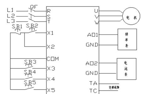 對立式水力碎漿機(jī)原有系統(tǒng)存在的問題,采用變頻器軟啟動和無極調(diào)速功能對原來控制系統(tǒng)進(jìn)行優(yōu)化。本系統(tǒng)選用阿爾法6000系列變頻器,具有多種保護(hù)功能,低頻啟動力矩大,啟動平滑,響應(yīng)快等特點。系統(tǒng)配置電路圖如下: