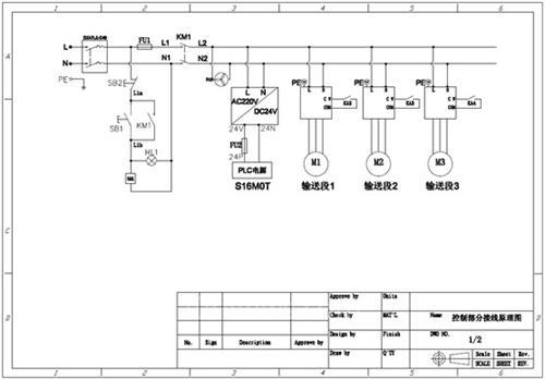 電氣繪圖:根據(jù)要求,選用了3個(gè)對射型光電開關(guān)和2個(gè)光纖傳感器。用CAD繪出了電氣控制原理圖和PLC接線圖: