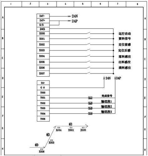控制要求:啟動(dòng)送電線輸送線X0,人工把包扎好的電線放入輸送線3,滿料X6感應(yīng)后延時(shí)停止;輸送線1首先準(zhǔn)備好接料(X2感應(yīng)即停止),當(dāng)X4入口未感應(yīng)時(shí)輸送線2啟動(dòng),輸送線2運(yùn)行直至X4感應(yīng)后停止(X3感應(yīng)即停止);輸送線1在X4感應(yīng)后啟動(dòng),步進(jìn)1格(X2感應(yīng)即停止),直至物料到出口X5有感應(yīng)后停止;包裝總線發(fā)出指令X1要料信號,輸送線1前進(jìn)1格,把X5感應(yīng)到的物料放到總包裝線上,輸出完成信號Y1。