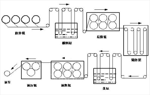 在紡織行業(yè)中,對棉紗高溫染色與上漿的加工程序應用非常普遍,生活中我們所穿的牛仔面料的紗線均通過上述加工過程實現(xiàn)。該種加工設備通常被稱為漿紗機,示意圖如下: