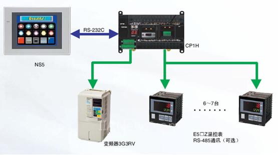 螺桿擠出機控制系統(tǒng)采用了CP1H PLC作主機控制螺桿的邏輯動作系統(tǒng),螺桿的壓力控制可采用變頻內部的PID控制或采用Dynisco ATC770的控制器。另外使用E5□Z溫控表控制螺桿各區(qū)的加熱,并且使用了RS-485通訊與CP1H進行通訊。本系統(tǒng)配有NS觸摸屏,為用戶提供現(xiàn)場人機對話界面。