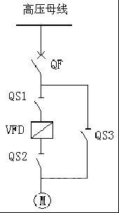此方案是手動(dòng)旁路的典型方案。原理是由3個(gè)高壓隔離開(kāi)關(guān)QS1、QS2和QS3和高壓開(kāi)關(guān)QF、電動(dòng)機(jī)M組成。要求QS2和QS3之間存在機(jī)械互鎖邏輯,不能同時(shí)閉合。變頻運(yùn)行時(shí),QS3斷開(kāi),QS1和QS2閉合;工頻運(yùn)行時(shí),QS1和QS2斷開(kāi),QS3閉合。高壓開(kāi)關(guān)QF、電動(dòng)機(jī)M為現(xiàn)場(chǎng)原有設(shè)備。