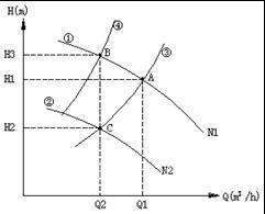 曲線①為負(fù)載按轉(zhuǎn)速N1工作時(shí)的特性曲線,曲線②為負(fù)載按轉(zhuǎn)速N2工作時(shí)的特性曲線,③④為管網(wǎng)的阻力曲線。
