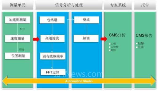 首先,測(cè)量單元可以對(duì)機(jī)械系統(tǒng)的速度、加速度、位移進(jìn)行測(cè)量,并進(jìn)入信號(hào)分析與處理,通過(guò)對(duì)包絡(luò)譜的濾波解析出固有故障頻率并通過(guò)FFT(傅里葉變換),然后對(duì)信號(hào)進(jìn)行整流和解調(diào)處理,送往專家系統(tǒng),專家系統(tǒng)通過(guò)對(duì)特征頻率的分析,可以判斷出工頻、二倍頻、共振等問(wèn)題的根源,然后報(bào)告系統(tǒng)可以為中央控制室發(fā)送監(jiān)測(cè)報(bào)告,預(yù)警系統(tǒng)故障。