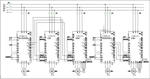 由于系統(tǒng)的線速度較高,涂膠和復(fù)合機(jī)構(gòu)采用偉創(chuàng)AC80B高性能矢量變頻器,頻率通道均主加輔的模式,主速度運(yùn)用UP/DOWN的方式,能夠同時(shí)幾個(gè)地方增減車速,輔助速度由電位器給定,系統(tǒng)中的涂膠輥和復(fù)合輥上都有精密測速裝置,兩輥的線速度可以通過電位器進(jìn)行微調(diào),使得車速在高速時(shí)得到穩(wěn)定運(yùn)行。