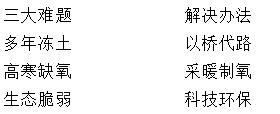 青藏高原的大風(fēng)、雷暴、強(qiáng)紫外線輻射、低溫,對(duì)人的健康形成嚴(yán)峻挑戰(zhàn),還有高達(dá)20多度的日溫差和年氣溫的劇烈變化,對(duì)工程的耐久性產(chǎn)生嚴(yán)重影響.空氣稀薄還對(duì)內(nèi)燃機(jī)動(dòng)力和電器設(shè)備的性能產(chǎn)生影響。所以,這一難題不解決就會(huì)對(duì)參建者的健康和生命安全造成嚴(yán)重威脅,就會(huì)減少橋涵等工程和機(jī)電設(shè)備的使用壽命和效率。