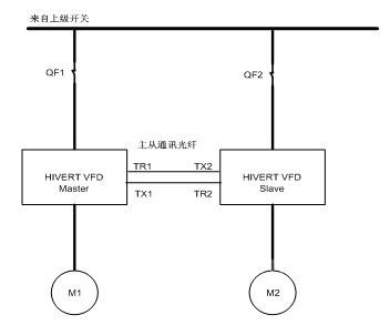 雙機聯(lián)動同步運行變頻系統(tǒng)是由完全獨立的兩臺變頻器通過主、從機的同步通訊方式保證雙電機的轉(zhuǎn)速、以及功率平衡的。兩臺電機中任意一臺都可作為主機,另一臺為從機。