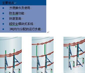 爬高時(shí),上夾緊帶被釋放,然后由協(xié)調(diào)工作的執(zhí)行器向上推高1.2 米,然后再被夾緊,下環(huán)被釋放。然后執(zhí)行器收緊,平滑地將下平臺(tái)拉上去,下平臺(tái)再被夾緊。下降時(shí)過程相反。這意味著整個(gè)平臺(tái)一體式升高和下降,而不是像傳統(tǒng)登高平臺(tái)那樣分段進(jìn)行,這樣有效確保了工作環(huán)境的安全。