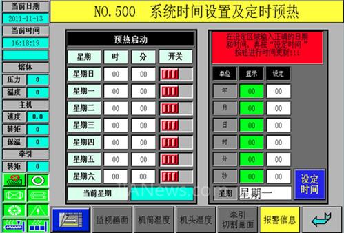 目前國內(nèi)大多數(shù)擠出機(jī)采用溫控表控制的方案,盡管該方案具有價(jià)格低的優(yōu)勢(shì)但是在控制功能上有很大局限性。采用此方案后可以對(duì)整個(gè)擠出過程的工藝參數(shù)如熔體壓力及溫度、各段機(jī)身溫度、螺桿和牽引的轉(zhuǎn)速、喂料量、各種原料的配比、電機(jī)的電流電壓等參數(shù)進(jìn)行在線檢測(cè)、并用其本身固有的閉環(huán)控制。這對(duì)保證工藝條件的穩(wěn)定、提高產(chǎn)品的精度極為有利。采用人機(jī)界面,利用人機(jī)界面反應(yīng)出來的報(bào)警信息,工作人員很容易排除故障。提高了生產(chǎn)效率。