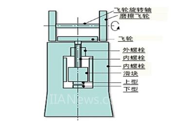 本文介紹的壓力機是螺旋壓力機。螺旋壓力機是用螺桿、螺母作為傳動機構,并靠螺旋傳動飛輪的正反向回轉運動轉變?yōu)榛瑝K的上下往復運動的鍛壓機械。啟動時,滑塊從起始位置快速加速到指定速度,快接近工件時,飛輪失去控制,自由減速,存貯在旋轉飛輪的動能轉化為沖擊能,打擊工件后,要求飛輪快速反轉(0.1S左右)離開工件,返回到某一位置后準備下一次打擊。