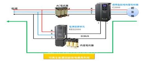 圖3:臺(tái)達(dá)起重系統(tǒng)采用REG2000取代煞車電阻,將位能轉(zhuǎn)換為再生電力回饋電網(wǎng)