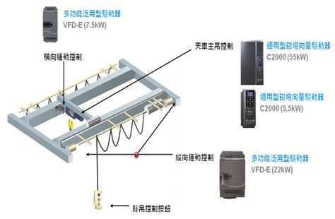 吊控制系統(tǒng), VFD-E系列進(jìn)行天車主吊的橫向或縱向運(yùn)動(dòng)控制。