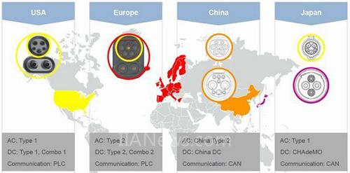 在充電接口方面,目前,國際上主要有五套充電樁標準,第一套是由國際電工委員會創(chuàng)立的標準ICE標準,其次是由美國汽車工程師協(xié)會創(chuàng)立的SAE標準,第三套是歐洲汽車工業(yè)協(xié)會提出的ACEA標準,第四套是由日本電動汽車協(xié)會和日本電動車充電協(xié)會推出的CHAdeMO標準,中國也于2006年推出了自己的標準,發(fā)布了《電動汽車傳導充電用插頭、插座、車輛耦合器和車輛插孔通用要求》。