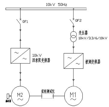 測試平臺系統(tǒng)采用10kV高壓電網(wǎng)供電,如圖(1)所示,10kV高壓電源分為兩路,一路直接給四象限變頻器供電,另一路直接接到調(diào)壓變壓器,變壓器可輸出3.3、6、10kV三個等級電壓,給被測試變頻器供電。被測試變頻器輸出經(jīng)過開關(guān)柜接到電機M1(電機M1為3.3、6、10kV三電壓等級電機),拖動電機M1與加載電機M2之間經(jīng)過聯(lián)軸器聯(lián)接。