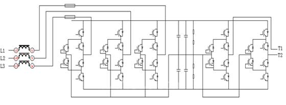 整機由三電平功率單元混聯(lián)組成,每相只有5個功率單元組成,每個功率單元三相1000V的輸入。功率單元內(nèi)部分為有源前端、直流濾波和逆變兩部分。有源前端和逆變部分均采用三電平二極管嵌位式結(jié)構(gòu),功率單元拓撲結(jié)構(gòu)如下圖: