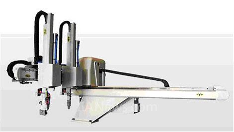 注塑機(jī)專用機(jī)械手臂根據(jù)抓取的材料種類、材料的形狀以及工藝的需求,分類十分繁雜。我們僅從機(jī)械的自由度上看,可以簡(jiǎn)單地把它們分為3軸的機(jī)械手臂和5軸的機(jī)械手臂,這里介紹的是應(yīng)用了安川運(yùn)動(dòng)控制系統(tǒng)的5軸機(jī)械手。如圖2所示: