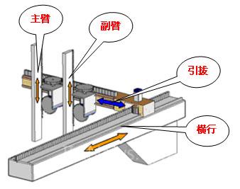 其主要由主臂、副臂、引拔、橫行4個(gè)機(jī)構(gòu)組成。主臂下端與托盤相連,用于抓取塑料制品的主干部分,副臂下端與夾具相連,用于夾取塑料制品的料頭部分(料頭:注塑產(chǎn)品成形時(shí)所留的多余部分)。引拔的功能是將主臂、副臂伸入注塑機(jī)工作面,再由橫行部分將已成形的產(chǎn)品運(yùn)送到指定的位置。5軸機(jī)械手臂主要應(yīng)用在產(chǎn)品體積較大、產(chǎn)品形狀較復(fù)雜的一些場(chǎng)合。在以前的機(jī)械手臂中,其驅(qū)動(dòng)動(dòng)力多采用氣缸或變頻電機(jī)來(lái)實(shí)現(xiàn),控制部分多采用單片機(jī)來(lái)實(shí)現(xiàn)。由于這些控制和驅(qū)動(dòng)有動(dòng)作速度低、精度不高等缺點(diǎn),替換成運(yùn)動(dòng)控制器和伺服電機(jī)之后則可以大大提高工作效率。