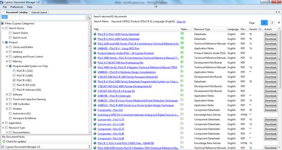 CDM管理著賽普拉斯所有產(chǎn)品的文檔。在這個工具內,您可以找到、查看并管理PSoC可編程片上系統(tǒng)、觸摸感應解決方案、存儲器和USB控制器的文檔。CDM可以打開網(wǎng)上或下載到用戶桌面的文檔。用戶能在下載前預覽文檔,然后只需點擊一下即可下載到PC。CDM還簡化了更新本地文檔的方式,只需點擊一下,就可以幫助用戶查看賽普拉斯網(wǎng)站上對應所有本地文檔的最新版本。
