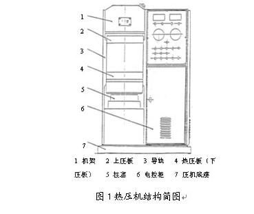 實(shí)驗(yàn)熱壓機(jī)是木材加工工業(yè)、科研單位、高等院校等的實(shí)驗(yàn)室設(shè)備之一,可作纖維板、刨花板、膠合板、表面裝飾板、塑料板等的熱壓實(shí)驗(yàn)之用。除了加熱系統(tǒng)外,其工作特征和結(jié)構(gòu)與生產(chǎn)型熱壓機(jī)基本相同。圖1為本文所研究的熱壓機(jī)結(jié)構(gòu)簡(jiǎn)圖。