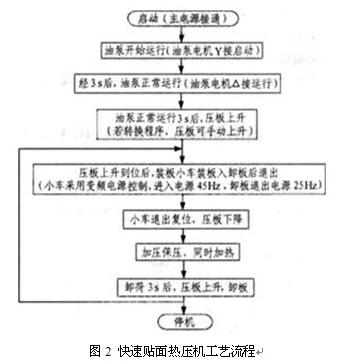 在小車卸板后退的同時(shí),壓板開始下降,當(dāng)碰到下限位開關(guān)后,停止下降,開始保壓并計(jì)時(shí),隨著油壓的升高,動(dòng)、定壓板之間壓力增大,當(dāng)達(dá)到設(shè)定上限壓力時(shí),電接點(diǎn)壓力表上限開關(guān)斷開,停止加壓。由各組電磁閥自動(dòng)控制熱壓時(shí)所需壓力,實(shí)現(xiàn)保壓直到熱壓結(jié)束,開始卸荷,3 s后壓板上升。由人工完成卸板。