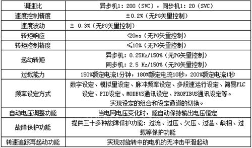 Goodrive300變頻器是深圳市英威騰電氣股份有限公司新開發(fā)的一款高性能開環(huán)矢量變頻器,具有V/F和無PG矢量兩種控制模式,其中在突加減載荷的情況下,速度波動非常輕微;可支持永磁同步電機(jī)、變頻器電機(jī)、直驅(qū)電機(jī)等,可以為用戶減少庫存,不再需要為不同的電機(jī)備用不同變頻器的庫存;具有準(zhǔn)確的電機(jī)參數(shù)自學(xué)習(xí)功能,支持旋轉(zhuǎn)自學(xué)習(xí)與靜態(tài)自學(xué)習(xí),其中靜態(tài)自學(xué)習(xí)可以在電機(jī)無法脫開負(fù)載的場合準(zhǔn)確的學(xué)習(xí)電機(jī)的參數(shù);具有先進(jìn)的全程三相調(diào)制方式,使電機(jī)運(yùn)行更平穩(wěn),噪音更小;其他的特性參數(shù)、功能如下表所示: