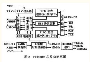 在USB的開發(fā)中,要求設(shè)計(jì)人員對USB的標(biāo)準(zhǔn)、Firmware(固件)編程及驅(qū)動程序的編寫等有較深入的了解;而基于FT245BM芯片的USB產(chǎn)品開發(fā),能夠使研發(fā)人員在最短的周期內(nèi)開發(fā)出相應(yīng)的USB產(chǎn)品。FT245BM芯片功能框圖如圖2所示,相關(guān)資源如下。