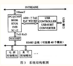 如圖3所示,該電路為了適應(yīng)各種不同場合的應(yīng)用,提供了3種接口:USB、RS 485串行口和10Mb以太網(wǎng)接口。作為局部控制系統(tǒng)中的上位控制總機(jī),它提供了完整的總線控制和遠(yuǎn)程通訊的功能。