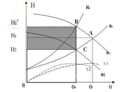風(fēng)機調(diào)整特性見圖5。風(fēng)機的正常工作點為A,當風(fēng)量需要從Q1 調(diào)到Q2 時,采用擋板調(diào)節(jié),管網(wǎng)特性曲線由R1改變?yōu)镽2,其工作點調(diào)至B點,其功率為OQ2BH2’所圍成的面積,其功率變化很小,而其效率卻隨之降低。當采用變頻調(diào)速時,可以按需要升降電機轉(zhuǎn)速,改變設(shè)備的性能曲線,圖中從n1 到n2,其工作點調(diào)至C點,使其參數(shù)滿足工藝要求,其功率為OQ2BH2 所圍成的面積,同時其效率曲線也隨之平移,依然工作在高效區(qū)。由于功率隨轉(zhuǎn)速3次方變化,故節(jié)能效果顯著。