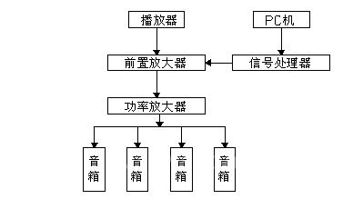 主要由音樂播放器、前置放大器、功率放大器、監(jiān)聽音箱及音柱組成,大多系統(tǒng)采用多媒體上位機(jī)程序播放音樂,其組成如圖一