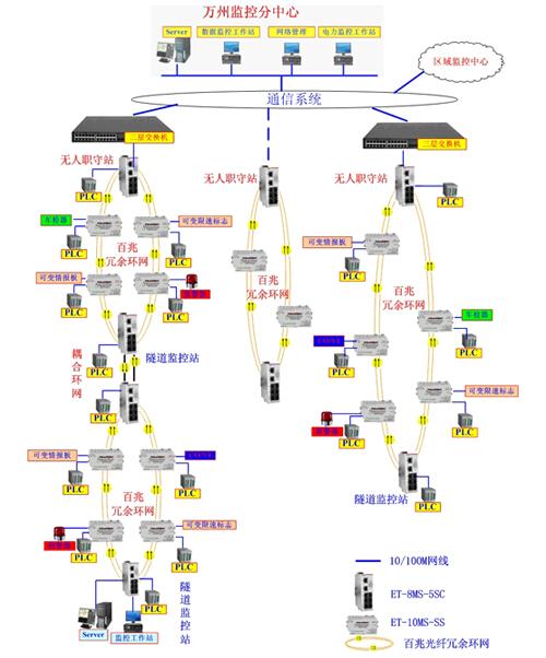 6個隧道監(jiān)控均由ET-10MS-SS和ET-8MS-5SC組成百兆光纖冗余環(huán)網(wǎng),部分隧道之間采用環(huán)間耦合進(jìn)行連接,實(shí)現(xiàn)了復(fù)雜網(wǎng)絡(luò)構(gòu)建,同時也提高了系統(tǒng)的高可靠性。隧道內(nèi)監(jiān)控數(shù)據(jù)通過構(gòu)建百兆光纖冗余環(huán)網(wǎng)傳到隧道無人通信站, 隧道無人通信站的ET-8MS-5SC工業(yè)以太網(wǎng)交換機(jī)與三層交換機(jī)相連接,實(shí)現(xiàn)業(yè)務(wù)透傳。三個隧道無人通信站之間通過光通信系統(tǒng)連接,傳送到萬州監(jiān)控分中心,再由萬州監(jiān)控分中心至區(qū)域監(jiān)控中心,萬州監(jiān)控分中心實(shí)現(xiàn)與隧道本地控制器的數(shù)據(jù)交換與控制。區(qū)域監(jiān)控中心也能實(shí)現(xiàn)與隧道本地控制器的數(shù)據(jù)交換與控制。