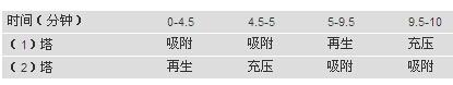 干燥器上的干燥塔成對(duì)配置,交替工作。標(biāo)準(zhǔn)工作周期為10分鐘。一個(gè)工作周期的工作狀況如下: