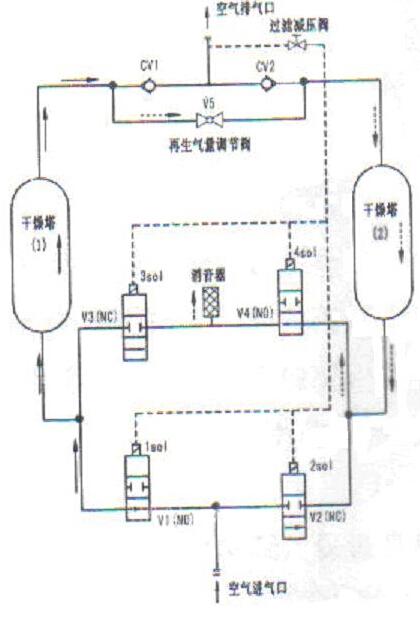 經(jīng)過冷凍干燥處理后的壓縮空氣接著進(jìn)入吸附干燥部分,然后成為達(dá)到露點(diǎn)指標(biāo)要求的干燥空氣,并再次流經(jīng)預(yù)冷器,使自身溫度升高,基本恢復(fù)為原先的體積流量供用戶使用。復(fù)合式干燥器中的吸附干燥部分采用雙塔結(jié)構(gòu),利用變壓吸附的機(jī)理,實(shí)現(xiàn)再生以及連續(xù)工作的目的。