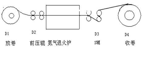 摘要:氮?dú)夤饬镣嘶馉t——是將不銹鋼薄板經(jīng)過(guò)氮?dú)夤饬镣嘶馉t,進(jìn)行高溫處理,使不銹鋼薄板變軟,再進(jìn)行后序的一系列加工處理,再形成成品。此道工序,對(duì)產(chǎn)品的質(zhì)量影響致關(guān)重要,所以對(duì)此有較高的要求。一般由幾個(gè)部分組成:放卷電機(jī)、前壓棍電機(jī)、S棍電機(jī)、收卷電機(jī)等。其放卷電機(jī)、前壓棍電機(jī)、S棍電機(jī)均為5.5 kW,收卷電機(jī)為30 kW。系統(tǒng)的操作過(guò)程——將一卷不銹鋼薄板,由放卷電機(jī),經(jīng)前壓輥牽引進(jìn)入退火爐,通過(guò)高溫加熱處理后,再經(jīng)S輥電機(jī)牽引,由收卷電機(jī)進(jìn)行收卷。工作過(guò)程中,各部分的恒線速度恒定,對(duì)產(chǎn)品的后序加工有著重要的影響。如下圖1所示: