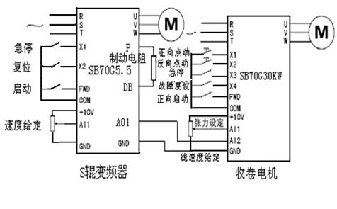 以S輥SB70G5.5 kW模擬輸出的頻率作為線速度的給定以供給收卷電機(jī),通過(guò)調(diào)節(jié)變頻器相應(yīng)輸入信號(hào)的增益、偏置作為線速度信號(hào),來(lái)進(jìn)行轉(zhuǎn)矩的運(yùn)算、限幅,從而實(shí)現(xiàn)S輥電機(jī)、收卷機(jī)線速度的恒定。變頻器原理接線圖如圖2所示: