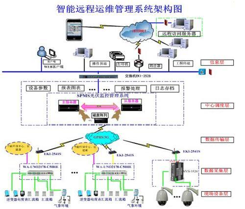 數(shù)據(jù)存儲與處理、數(shù)據(jù)挖掘與分析部分:研華光伏智能管理軟件SPMS采用B/S(Browser/Server)架構(gòu),支持分布式的監(jiān)控節(jié)點及服務(wù)器冗余,用戶工作界面是通過WWW瀏覽器來實現(xiàn),主要事務(wù)邏輯在服務(wù)器端實現(xiàn),形成模型-視圖-控制三層結(jié)構(gòu)。這樣就大大簡化了客戶端電腦載荷,減輕了系統(tǒng)維護。系統(tǒng)提供電網(wǎng)調(diào)度接口,方便與電網(wǎng)智能化系統(tǒng)對接。