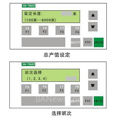 主要依據(jù)TD2X配置完成參數(shù)設定顯示菜單,共設計菜單有:完成總產、班產累計顯示、換班設定、錠子速度、前羅拉速度、捻度、細紗管線長度統(tǒng)計等參數(shù)顯示,以及一些參數(shù)設置畫面,可完成參數(shù)的設定、錯誤設置或出錯報警提示等功能,共編輯系統(tǒng)鍵5個共八組。
