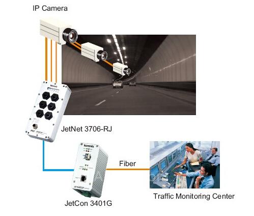 在多車的隧道內(nèi)環(huán)境內(nèi),要求系統(tǒng)必須能夠抵擋持續(xù)的震動(dòng)和高濕多塵情況的影響。因此,系統(tǒng)集成商選用JetNet 3706-RJ交換機(jī)為隧道內(nèi)的IP攝像頭供電。JetNet 3706-RJ 工業(yè)PoE以太網(wǎng)供電交換機(jī),滿足IP67工業(yè)防護(hù)等級(jí),防水防塵,克服了惡劣環(huán)境應(yīng)用的各項(xiàng)難題。同時(shí)還支持IEEE802.3af以太網(wǎng)供電標(biāo)準(zhǔn),無需額外鋪設(shè)電源線,降低了項(xiàng)目實(shí)施及維護(hù)的周期和成本。實(shí)現(xiàn)了實(shí)時(shí)交通管理,并使用JetCon 3401G千兆光電信號(hào)轉(zhuǎn)換器,提供高品質(zhì)高帶寬遠(yuǎn)距離連接,將現(xiàn)場影像傳送回交通控制中心。