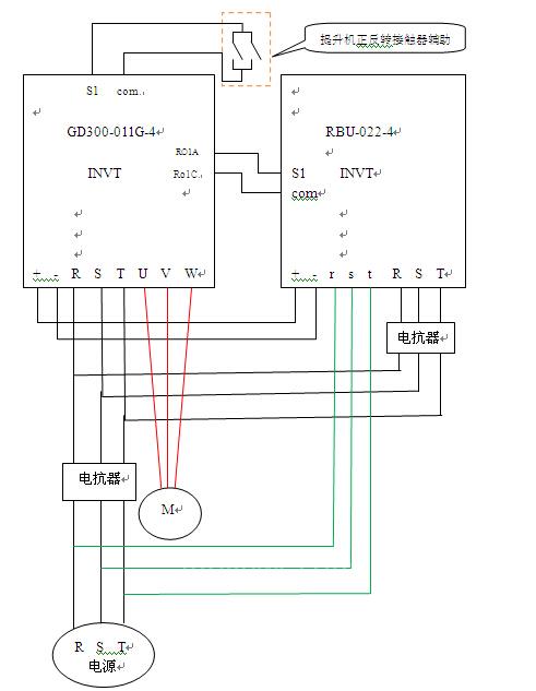 廣州電路器材有限公司是南方電網(wǎng)的下屬公司,主要生產(chǎn)跟電網(wǎng)有關(guān)的設(shè)備,電線桿,電線塔等產(chǎn)品,共有六十多臺行車需要進(jìn)行節(jié)能改造,要求改造后節(jié)電率達(dá)到20%以上,運(yùn)行可靠平穩(wěn),故障率要低,不能影響生產(chǎn),先安裝一臺看效果,如果效果顯著,再大面積推廣,由于行車中用電量最大的是提升馬達(dá),所以改造提升馬達(dá)是效果最好的,而且是投資回報(bào)最快的,所以選一臺7.5KW的提升馬達(dá)作為節(jié)能改造的樣機(jī),由于是提升馬達(dá)要求起動(dòng)轉(zhuǎn)矩要大,要有一定的過載能力,要快速起動(dòng)停止,所以必須是矢量變器,并要配置能量回饋單元,滿足快速停車不過壓的要求,并把下降時(shí)馬達(dá)回饋的電能回饋到電網(wǎng)提高節(jié)電率,并在系統(tǒng)中加入市電節(jié)電的轉(zhuǎn)換功能,保證節(jié)電系統(tǒng)有故障時(shí)轉(zhuǎn)為市電運(yùn)行,不影響生產(chǎn)。英威騰變頻器GD300-011G-4具有開環(huán)矢量運(yùn)行功能,起動(dòng)轉(zhuǎn)矩大,運(yùn)行平穩(wěn)可靠,由它驅(qū)動(dòng)7.5KW的提升馬達(dá)完全保證重載時(shí)不過流,不報(bào)故障。滿足客戶故障率低的要求,能量回饋選擇英威騰RBU-022-4,保證節(jié)電系統(tǒng)的可靠性。節(jié)電系統(tǒng)線路圖如2圖: