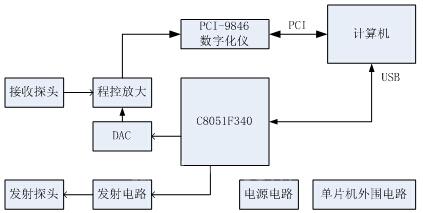 超聲波檢測系統(tǒng)由計(jì)算機(jī)、PCI-9846數(shù)字化儀、C8051F340單片機(jī)、電源、發(fā)射電路、程控放大電路組成,其整體結(jié)構(gòu)如圖1所示。