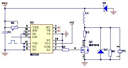 脈沖由U1的12腳輸入,特別注意IR2110的選擇,如果直接使用脈沖驅(qū)動(dòng)IRF7450,由于隔離、驅(qū)動(dòng)的原因,得不到理想的高壓脈沖驅(qū)動(dòng)。IRF7450是Vds=500V的MOSFET,其電流可以達(dá)到20A左右,可以滿足理想開關(guān)快速切換的要求,儲(chǔ)能線圈L1在開關(guān)的控制下產(chǎn)生高壓,其中二極管D1與D2分別起保護(hù)作用,超聲波換能器V1可以采用美國GE公司的014LJM,也可以根據(jù)應(yīng)用換裝其它型號。
