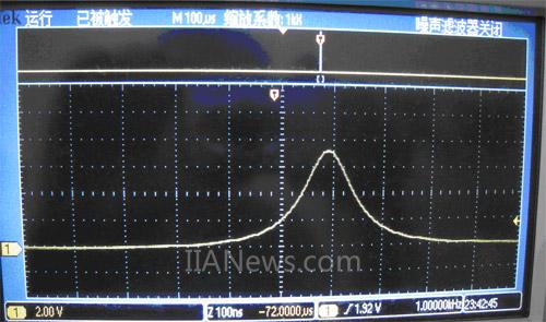 圖3所示為產(chǎn)生的高壓脈沖,測量時(shí)在示波器加一個(gè)純阻性25倍衰減頭,圖中縱軸為2V/格,橫軸為100ns/格,使用瞬態(tài)電平激發(fā)同步,可見產(chǎn)生的脈沖幅度在近200V左右,脈沖寬度為300ns左右。