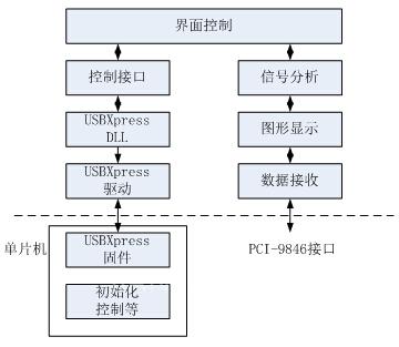 系統(tǒng)軟件主要包括控制部分、數(shù)據(jù)接收部分和信號分析部分三個(gè)部分,控制軟件決定整個(gè)系統(tǒng)的運(yùn)行,它一方面通過USB口與總控的單片機(jī)進(jìn)行通信,統(tǒng)一控制整個(gè)系統(tǒng)的發(fā)射、接收等過程,同時(shí)通知數(shù)據(jù)接收軟件進(jìn)行數(shù)據(jù)接收并顯示。數(shù)據(jù)接收軟件則只負(fù)責(zé)將PCI-9846采樣的數(shù)據(jù)存儲(chǔ)到指定位置,信號分析軟件則完成采樣信號的顯示、分析處理等過程。整個(gè)程序框架如圖4所示。