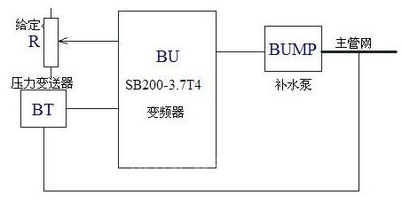 為更進(jìn)一步的節(jié)能,對(duì)換熱站實(shí)施了自動(dòng)化改造,循環(huán)泵和補(bǔ)水泵用變頻調(diào)節(jié),整個(gè)城市供熱系統(tǒng)用計(jì)算機(jī)進(jìn)行監(jiān)控,實(shí)現(xiàn)了換熱站無人值守。通過循環(huán)泵使熱水在供熱系統(tǒng)中運(yùn)行,管道、閥門的泄漏引起循環(huán)水的水壓降低,如不及時(shí)補(bǔ)水,會(huì)造成供熱系統(tǒng)運(yùn)行不正常。補(bǔ)水泵的變頻泵補(bǔ)水方式比較簡(jiǎn)單,采用恒壓供水方式,設(shè)定壓力為4kg。本例選用一臺(tái)SB200-3.7T4變頻器,選用森納斯DG130W-BZ-A 1MPa壓力變送器,變頻調(diào)速補(bǔ)水系統(tǒng)如圖所示: