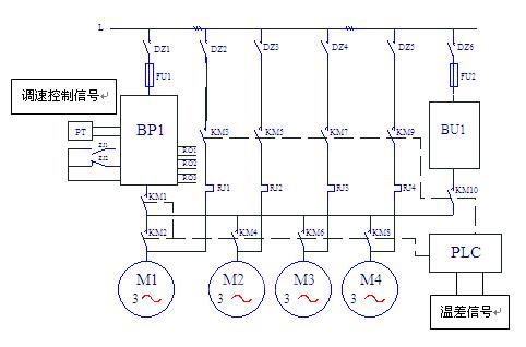 圖中,BP1—森蘭SB200-37T4變頻器,BU—軟啟動(dòng)器(自耦減壓起動(dòng)器),系統(tǒng)采用循環(huán)投切方式,溫差信號(hào)送入PLC,經(jīng)過PLC處理后,到變頻器作為調(diào)速控制信號(hào)。整個(gè)系統(tǒng)的運(yùn)行信息由PLC送到計(jì)算機(jī)上。