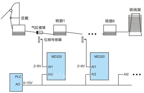 其工作原理是:根據(jù)操作工在面板設定決定作業(yè)的速度,該速度的模擬信號進入PLC,PLC考慮加減速度的時間之后按照一定的斜率輸出該模擬信號。這樣做的目的主要是滿足點動、穿絲等一些作業(yè)的需要。PLC輸出的模擬電壓信號同時接到所有變頻器的AI2(AI1也可以)輸入端,作為速度的主給定信號。各擺臂位移傳感器的信號接入到對應的轉(zhuǎn)鼓驅(qū)動變頻器作為PID控制的反饋信號。根據(jù)擺臂在中間的位置,自己設定一個PID的給定值。這個系統(tǒng)是非常典型的帶前饋的PID控制系統(tǒng),一級串一級,PID作為微調(diào)量。