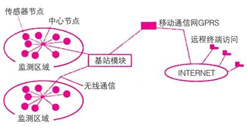應(yīng)用于礦井環(huán)境監(jiān)測(cè)的無(wú)線傳感器網(wǎng)絡(luò)基本結(jié)構(gòu)由傳感器節(jié)點(diǎn)和中心節(jié)點(diǎn)組成,不同的監(jiān)測(cè)區(qū)域均有中心節(jié)點(diǎn),每個(gè)中心節(jié)點(diǎn)負(fù)責(zé)處理本區(qū)域內(nèi)的傳感器節(jié)點(diǎn)傳送過(guò)來(lái)的無(wú)線數(shù)據(jù),而基站模塊負(fù)責(zé)接收來(lái)自各個(gè)監(jiān)測(cè)區(qū)域內(nèi)的中心節(jié)點(diǎn)發(fā)送出的無(wú)線信號(hào),基站模塊最終可接入互聯(lián)網(wǎng),使得無(wú)線傳感器網(wǎng)絡(luò)的信息能夠被遠(yuǎn)程終端訪問(wèn)到,系統(tǒng)結(jié)構(gòu)如圖1所示。