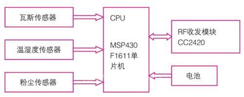 在煤礦生產(chǎn)過(guò)程中,礦井中的物理環(huán)境可以由瓦斯傳感器、溫濕度傳感器、粉塵傳感器等進(jìn)行感知[3],這些傳感器的輸出信號(hào)由msp430f1611單片機(jī)(文中采用telosb硬件平臺(tái))接收,經(jīng)過(guò)cpu的處理后,利用rf收發(fā)模塊cc2420可將輸出信息進(jìn)行無(wú)線發(fā)送,傳感器節(jié)點(diǎn)的電源由電池提供。傳感器網(wǎng)絡(luò)節(jié)點(diǎn)的硬件結(jié)構(gòu)如圖2所示。