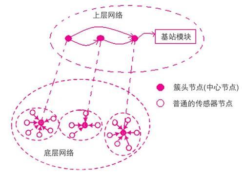 拓?fù)浣Y(jié)構(gòu)的設(shè)計(jì)具有很強(qiáng)的針對(duì)性,設(shè)計(jì)何種拓?fù)浣Y(jié)構(gòu)是根據(jù)所需的應(yīng)用場(chǎng)景而提出的。礦井開(kāi)拓即從地面向地下開(kāi)掘一系列井巷,通至采區(qū),隨著開(kāi)采的進(jìn)行,井下巷道的形狀和位置不斷變化。依據(jù)傳感器節(jié)點(diǎn)之間的位置,將網(wǎng)絡(luò)中的所有節(jié)點(diǎn)劃分為一個(gè)個(gè)的簇單元,每個(gè)簇單元采用星型拓?fù)浣Y(jié)構(gòu)并且有一個(gè)簇頭節(jié)點(diǎn)(中心節(jié)點(diǎn))。因此,在整個(gè)無(wú)線傳感器網(wǎng)絡(luò)中就存在著兩種類型的傳感器節(jié)點(diǎn):普通的傳感器節(jié)點(diǎn)和簇首節(jié)點(diǎn)(中心節(jié)點(diǎn))。我們將礦井監(jiān)測(cè)系統(tǒng)分成兩個(gè)子系統(tǒng),第一個(gè)子系統(tǒng)由低傳輸范圍的和能量受限的簇節(jié)點(diǎn)組成,而另一個(gè)子系統(tǒng)由傳輸范圍較遠(yuǎn)并且具有更多能量供給的簇首節(jié)點(diǎn)(中心節(jié)點(diǎn))組成。第一個(gè)子系統(tǒng)形成了無(wú)線傳感器網(wǎng)絡(luò)的底層網(wǎng)絡(luò),而第二個(gè)子系統(tǒng)則形成了該傳感器網(wǎng)絡(luò)的上層網(wǎng)絡(luò)[4]。整個(gè)傳感器網(wǎng)絡(luò)的拓?fù)浣Y(jié)構(gòu)如圖3所示。