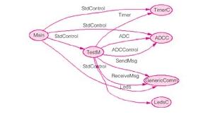根據(jù)程序的功能確定所需的組件為:main,testm,timerc,genericcomm,ledsc,adcc。在本文中,genericcomm組件的功能是接收上級(jí)節(jié)點(diǎn)發(fā)送來(lái)的命令,決定是否獲取傳感器的數(shù)據(jù)并將獲得的數(shù)據(jù)無(wú)線發(fā)送出去;timerc組件的功能是觸發(fā)節(jié)點(diǎn)adc采集傳感器數(shù)據(jù)且可設(shè)定采集頻率;adcc組件實(shí)現(xiàn)對(duì)模/數(shù)轉(zhuǎn)換器的控制;ledsc組件的作用是控制傳感器節(jié)點(diǎn)上led燈的顯示。該程序的程序結(jié)構(gòu)組件圖如圖4所示。