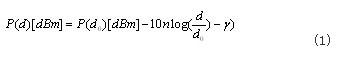 其中,p(d)為接收信號(hào)強(qiáng)度(dbm);p(d0)為發(fā)送信號(hào)強(qiáng)度(dbm);n為路徑長(zhǎng)度和傳輸損耗之間的比例因子;d0表示參考節(jié)點(diǎn)和基站間的距離;d為未知節(jié)點(diǎn)和基站間的距離;γ為修正因子,根據(jù)經(jīng)驗(yàn)進(jìn)行修正。